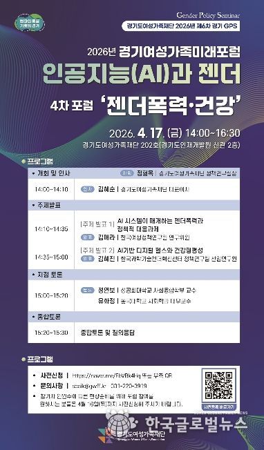 (한국글로벌뉴스 - 박소연 기자) 경기도여성가족재단은 오는 17일 재단 회의실에서 ‘인공지능과 젠더폭력·건강’을 주제로 4차 경기여성가족미래포럼을 개최한다. 3월부터 5월까지 총 5차례 진행하는 경기여성가족미래포럼 중 이번이 4회차다.