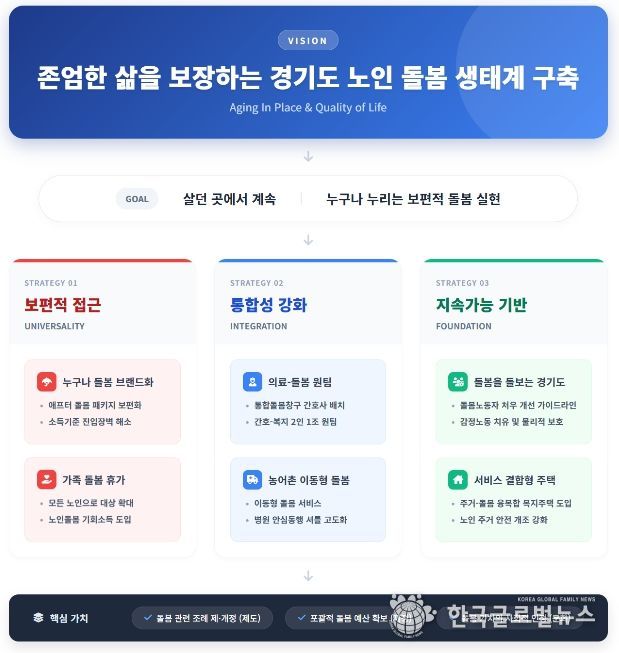 (한국글로벌뉴스 - 박소연 기자) 경기연구원이 빠르게 늘어나는 노인 인구에 대응해 ‘돌봄 생태계’ 구축을 핵심 해법으로 제시했다. 단순히 시설을 늘리는 방식이 아니라, 노인이 살던 집과 지역에서 계속 살아갈 수 있도록 다양한 돌봄 주체가 연결되는 새로운 시스템이다.