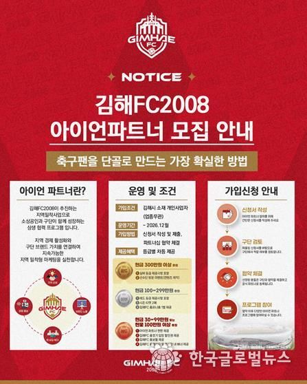 (한국글로벌뉴스 - 박지형 기자) 김해FC2008이 지역 상생 및 경제 활성화를 위한 프로젝트의 일환으로 소상공인과 구단이 함께 성장하는 상생 협력 프로그램‘아이언 파트너’를 모집한다고 밝혔다.