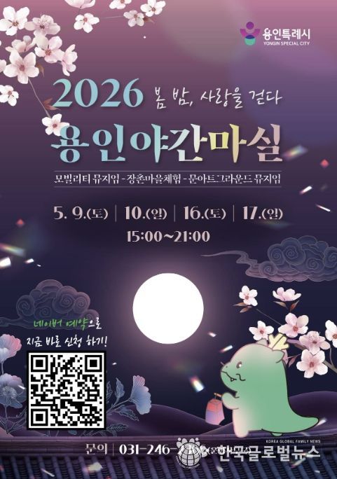 (한국글로벌뉴스 - 박소연 기자) 용인특례시는 5월 14일까지 용인의 아름다운 야경을 즐길 수 있는 체험형 관광 프로그램 ‘2026 용인 야간 마실’ 참가자를 모집한다고 15일 밝혔다.