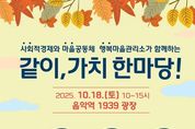 (한국글로벌뉴스 - 박소연 기자) 가평군은 오는 18일 오전 10시부터 오후 3시까지 음악역 1939 광장에서 주민과 함께하는 축제 ‘2025년 같이, 가치 한마당’을 연다. 이번 행사는 사회적경제기업의 판로 확대와 마을공동체, 경기행복마을관리소의 활동 성과를 알리고 주민 참여를 확대하기 위해 마련됐다. 행사에는 사회적경제기업 5곳, 마을공동체 16곳, 경기행복마을관리소 4곳 등 총 25개 단체가 참여한다. 이날 주민들은 현장에서 직접 사회적경제기업의 제품을 구매할 수 있으며, 공동체별 특색 있는 프로그램을 즐길 수 있다. 주요 프로그램은 △사회적경제기업 생산품 홍보·판매 △공동체와 경기행복마을관리소 활동 전시 및 무료 체험 △합창·뮤지컬 갈라쇼·힐링체조 등 공연 △경품 이벤트 등이 마련돼 있다. 특히 가평마을교육공동체가 제작한 단편영화 상영 등 주민 주도 콘텐츠도 선보일 예정이다. 가평군 관계자는 “‘같이, 가치 한마당’ 축제를 통해 지역사회에서 사회적경제와 공동체 활동이 더욱 확산되기를 기대한다”며 “이번 행사가 지역경제의 활력으로 이어질 수 있도록 주민 여러분의 많은 방문과 성원을 부탁드린다”
