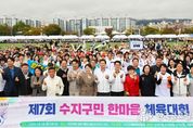(한국글로벌뉴스 - 박소연 기자) 용인특례시 수지구는 18일 아르피아 상부 체육시설에서 ‘제7회 수지구민 한마음 체육대회’를 개최했다. 수지구 체육연합회가 주최·주관한 이번 대회엔 구민 약 2000여 명이 참여해 승부차기, 볼풀공 바구니농구, 줄다리기, 계주 등으로 구민 모두 한마음으로 어우러지는 시간을 보냈다. 또 식전 공연인 동천동 훌라댄스, 신봉동 밸리댄스와 단국대학교 치어리딩팀 ‘아스테르’의 공연, 퓨전 장구, 보컬그룹 ‘뮤랑’, 마술사 홍승인, 초대 가수 김성환 등이 다채로운 무대를 선보였다. 행사장 곳곳에선 화분 만들기, 친환경 리필스테이션(세제 담아가기), MBTI 검사, 캘리그라피 체험, 키링 만들기, 구민 건강 서비스 안내 부스 등 체험 프로그램이 운영됐다. 이상일 시장은 “우리 수지구민들이 모처럼 한자리에 모여 우정을 나누면서 행사를 통해 행복한 시간을 많이 보내시라고 비가 그친 것 같다”며 “수지중앙공원은 축구장 76개 크기의 시민 힐링 공간으로 조성되고 있고, 상현3동 행정복지센터와 함게 건립되는 광교스포츠센터에는 25m레인 10개의 수영장이 들어서게 된다"며 "서울종합운동장역