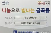 (한국글로벌뉴스 - 박소연 기자) 지난 29일 수원시 권선구 금곡동 행정복지센터는 한주오토시스템즈(주)로부터 저소득 가정을 지원하기 위한 성금 300만 원을 전달받았다고 밝혔다. 이번에 전달된 성금 300만 원은 금곡동 관내 저소득 가정을 대상으로 한 특화사업 및 맞춤형 복지사업에 활용될 계획이다. 한주오토시스템즈(주) 조성문 대표는 “연말을 맞아 지역 내 어려운 이웃들에게 작은 보탬이 되길 바란다”며 “앞으로도 지역사회와 함께 성장하며 나눔을 실천하는 기업이 되도록 노력하겠다”라고 말했다. 장성임 금곡동장은 “연말을 맞아 어려운 이웃을 위해 따뜻한 나눔을 실천해 주신 한주오토시스템즈(주)에 깊이 감사드린다”며 “앞으로도 지역사회와 상생하는 기업으로 지속적인 역할을 해주시길 기대한다”라고 말했다.