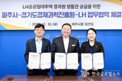 (한국글로벌뉴스 - 박종욱 기자) 파주시는 30일 경기도경제과학진흥원, 한국토지주택공사 경기북부지역본부와 경과원 파주시 이전에 따른 엘에이치(LH) 공공임대주택 생활관 지원을 위한 업무협약을 체결했다고 밝혔다. 이번 협약은 경과원의 단계적 이전에 앞서 직원들에게 안정적인 정주환경을 제공함으로써 거주지 이전에 따르는 비용 부담을 최소화하기 위한 세 기관간 협력을 강화하는 차원에서 추진됐다. 협약에 따라 한국토지주택공사는 운정신도시 내 공공임대주택 중 보유 공실 일부를 생활관 용도로 활용할 수 있도록 공급 방안을 검토하고, 파주시는 입주 절차와 행정적 지원을 담당한다. 경과원은 대상자 선정과 운영 관리 등 내부 절차를 마련해 실제 입주가 차질 없이 진행될 수 있도록 준비할 계획이다. 김경일 파주시장은 “이번 협약이 파주에 둥지를 틀게 될 경과원 직원들이 걱정 없이 생활할 수 있는 실질적인 지원이 될 것으로 기대한다”라고 말했다. 김현곤 경기도경제과학진흥원장은 “직원들의 주거 부담을 줄이는 것은 이전 성공의 핵심 요소”라며 “세 기관이 함께 만들어가는 협력체계가 앞으로도 좋은 모델이 되길 바란다”라고 전했다. &nb