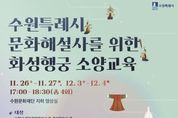 (한국글로벌뉴스 - 박소연 기자) 수원특례시가 문화해설사를 대상으로 화성행궁 고증 연구 결과를 교육해 ‘연구 기반 문화해설’을 정착시킨다. 수원시는 11월 26~27일, 12월 3~4일 4회에 걸쳐 수원문화재단에서 ‘수원특례시 문화해설사를 위한 화성행궁 소양교육’을 한다. 유네스코독일위원회와 유네스코한국위원회가 지원하는 이번 교육에는 수원문화재단·수원화성박물관·수원청소년청년재단 등에서 수원화성과 화성행궁을 해설하는 문화해설사들이 참여한다. 화성행궁 고증 연구의 성과를 해설 현장에 연결하기 위한 교육이다. 연구를 수행한 전문가들이 강사로 나선다. 강의 주제는 ▲화성행궁의 변화와 이중적 기능(이선희 중앙대 교수) ▲1794년 화성행궁 중심 영역의 건축적 변화(이연노 건축문헌고고스튜디오 건축구조실장) ▲화성행궁의 발굴(이승연 건축문헌고고스튜디어 건축고고실장) ▲화성행궁 생활상 고증과 공간 재현(정정남 건축문헌고고스튜디오 대표) 등이다. 수원시는 화성행궁 2단계 복원을 추진하면서 건축물 외형 복원뿐 아니라, 내부 고증에 대한 연구의 필요성을 인식하고, 2023~2024년 ‘화성행궁 생활상 고증 및 재현 방