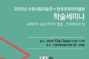 (한국글로벌뉴스 - 박소연 기자) 경기도 수원시립미술관은 한국큐레이터협회와 함께 2025년 학술 세미나 '큐레이터 공동 연구와 협업-코퍼레이션 힙'을 주제로 12월 12일 오후 1시 수원시립미술관 행궁 본관에서 개최한다. 이번 세미나는 기관과 기획자 간 연구의 지평을 확장하는 담론의 장을 위해 수원시립미술관과 한국큐레이터협회가 업무협약을 체결하고 공동 연구와 협업 사례를 조명한다. 세미나는 “큐레이터 공동 연구와 협업-코퍼레이션 힙”을 주제로 김현숙 KISO미술연구소 소장이 한일 공동 연구 전시 사례로서 《한일 근대미술가들의 눈》의 연구 과정을 발표하며 세미나의 첫 문을 연다. 전북도립미술관 이애선 관장은 “빈손의 연대, 가득한 변화 – 연대는 선택이 아닌 책임”이라는 주제로 전라북도 소재 예술기관들의 협업과 연대 사례를 살펴보며, 이영준 김해문화관광재단 정책홍보팀장은 공동 연구와 협업 전시가 어우러진 사례로서 “문예회관 전시실, 협업과 연대로 풀어보는 대안들”을 발표한다. 2부에서는 한국화학연구원 고영주 전문경영위원이 “대전 과학예술 융합 사례”에 관한 연구를 공유하고, 박지영 독립큐레이터는 경남도립미술관에서 기획한 《실
