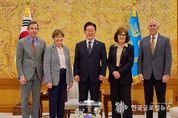 (한국글로벌뉴스 - 박소연 기자) 이재명 대통령은 4월 2일 오후 청와대에서 진 섀힌(Jeanne Shaheen) 상원 외교위원회 간사 등 공화·민주 양당 의원으로 구성된 미국 상원의원 대표단을 접견했다. 이 대통령과 미 대표단은 한미동맹 및 한반도 문제를 비롯해 중동 전쟁의 안보적·경제적 파장과 대응 방안에 대해 심도 있는 의견을 교환하고, 향후 경제적 여파 대응 과정에서 한미가 긴밀히 소통해 나가는 것이 중요하다는 점에 뜻을 같이 했다. 이 대통령은 지난 70여 년간 발전을 거듭한 한미동맹이 안보와 경제를 넘어 첨단기술과 전략산업 등을 아우르는 ‘미래형 포괄적 전략동맹’으로 발전한 점을 높이 평가했다. 또한 올해는 대미 투자 패키지를 포함해, 원자력의 평화적 이용, 핵추진잠수함, 조선 등 지난해 양국 정상 간 합의한 핵심적인 분야에서 구체적인 협력을 진전시켜 나갈 수 있도록 미국 상원이 적극적으로 지지해줄 것을 당부했다. 미 대표단도 최근 중동전쟁 등 국제정세가 불안정한 상황에서도 한미동맹에 대한 지지와 미국의 굳건한 한반도 안보 공약에는 변함이 없을 것임을 재확인했다. 이 대통령이 한반도 비핵화와 평화·안정을 위한 우
