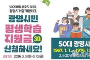 (한국글로벌뉴스 - 박소연 기자) 광명시가 50대 중장년 시민의 배움 기본권 보장을 위해 올해도 평생학습지원금 지원을 이어간다. 시는 오는 3월 3일부터 13일까지 11일간 ‘2026년 광명시민 평생학습지원금’ 신청을 받는다고 26일 밝혔다. 광명시민 평생학습지원금은 생애 전환기를 맞은 50대 시민이 나이·소득·배경과 관계없이 배움을 지속할 수 있도록 생애 1회 1인당 30만 원의 평생학습이용포인트를 지원하는 사업이다. 시민 스스로 자신의 삶과 필요에 맞는 학습을 선택하도록 돕는 것이 핵심 목적이다. 박승원 광명시장은 “배움은 선택이 아닌 누구에게나 보장돼야 할 기본권”이라며 “시민이 나이나 환경의 제약 없이 언제든지 배움을 이어갈 수 있도록 평생학습 기반을 더욱 탄탄히 만들어가겠다”고 밝혔다. 신청 대상은 1967년 1월 1일부터 1976년 12월 31일 사이에 출생한 50대 광명시민이다. 광명시에 1년 이상 계속 거주했거나, 거주기간을 합산해 5년 이상 거주하고 있어야 한다. 시는 총 2천500명을 선정해 지원한다. 59세(1967년생)는 올해가 마지막 지원 대상임을 고려해 우선 선정하고, 1968~1976년생은 무작위 추첨해 대상자를 결정한다. 광명시민