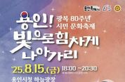 (한국글로벌뉴스 - 박소연 기자) 용인특례시은 광복 80주년을 기념해 광복절 당일인 15일 오후 6시 ‘용인! 빛으로 힘차게 나아가리’ 행사를 개최한다고 1일 밝혔다. 이 행사는 광복 80주년의 역사적 의미를 되새기고 용인의 밝은 미래를 기원하기 위한 희망의 메시지를 담은 시민 문화축제로 기획했다. ‘용인! 빛으로 힘차게 나아가리’는 기미독립선언서의 마지막 문구인 ‘다만, 앞길의 광명을 향하여 힘차게 나아갈 뿐이로다’를 인용한 구호다. 시는 이 행사를 시민이 직접 참여하고 즐길 수 있도록 ▲경기동부보훈지청 ▲광복회 용인특례시지회 ▲용인교육지원청 ▲용인문화원 ▲용인문화재단 ▲용인시청소년미래재단 ▲단국대학교 총학생회와 함께 ‘광복 80주년 T/F’를 구성해 다양한 문화 축제를 마련했다. 축제는 시민 누구나 무료로 참여할 수 있으며, 비가 올 경우에는 실내행사로 대체 할 수 있다. 15일 오후 5시부터 6시까지 시청 에이스홀에서는 ‘제80주년 광복절 경축식’이 열린다. 이 행사에는 용인지역의 독립유공자 후손과 국가유공자를 초청해 대한민국의 독립을 위한 유공자와 유공자 가족에 대한 감사의 뜻을