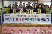 (한국글로벌뉴스 - 박소연 기자) 수원시 영통구 매탄2동 행정복지센터는 지난 3일, 설 명절을 맞아 관내 어려운 이웃을 위한 ‘이웃사랑 나눔 전달식’을 개최했다. 이번 전달식에는 매탄2동 단체장협의회, 인근 상가, 주민들이 정성껏 마음을 모아 백미 150포, 생필품 300세트, 컵라면 32박스 등 후원 물품을 마련했다. 모아진 물품은 관내 복지 사각지대 발굴 대상자와 저소득 취약계층 가구에 전달되며, 안부 확인도 함께 진행할 예정이다. 승병숙 매탄2동장은 “설 명절을 맞아 도움이 필요한 어려운 이웃을 위해 올해도 잊지 않고 후원해 주신 모든 분들께 감사드리며, 관내 어려운 분들이 따뜻한 설 명절을 보낼 수 있도록 후원물품을 잘 전달하겠다”고 말했다. 한편 매탄2동은 이번 나눔 전달식을 비롯해, 연중 취약계층 대상 지원 사업과 복지 사각지대 발굴 활동을 통해 지역 주민들이 체감할 수 있는 복지 서비스를 제공하고 있다.
