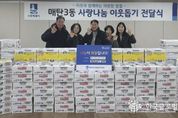 (한국글로벌뉴스 - 박소연 기자) 수원시 영통구 매탄3동은 지난 4일, 매탄중심상가상인회로부터 설 명절을 맞이해 관내 취약계층을 위한 라면 100박스와 햇반 110박스를 기탁받았다고 밝혔다. 이번 기탁은 설 명절을 앞두고 지역사회에 따뜻한 활력을 불어넣고, 이웃과 함께 정을 나누고자 하는 상인회 회원들의 자발적인 참여로 마련됐다. 기탁된 물품은 매탄3동 행정복지센터를 통해 기초생활수급 가구, 차상위 가구 등 저소득층 이웃들에게 전달되어, 모두가 풍성하고 든든한 명절을 보낼 수 있도록 지원될 예정이다. 정희경 매탄중심상가상인회장은 “설 명절만큼은 우리 주변의 어려운 이웃들이 소외되지 않고 따뜻한 정을 느끼며 든든하게 보내시길 바라는 마음으로 회원들과 정성을 모았다”며, “앞으로도 지역 상인들이 힘을 합쳐 주변을 살피고 나눔을 실천하는 활동에 적극 앞장서겠다”고 전했다. 김병목 매탄3동장은 “매년 명절마다 지역사회를 위한 나눔을 실천해 주시는 매탄중심상가상인회에 진심으로 감사드린다”며 “기탁해 주신 물품은 상인분들의 따뜻한 마음과 함께 관내 어려운 이웃들에게 소중히 전달하겠다”고 감사의 뜻을 전했다.