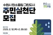 (한국글로벌뉴스 - 박소연 기자) 수원특례시가 ‘생활 속 탄소중립 실천’을 확산하기 위해 2월 12일부터 20일까지 탄소중립 그린도시 사업 대상지 주민·생활권자를 대상으로 ‘수원시 탄소중립 그린도시 주민실천단’ 신규 참여자를 모집한다. 주민실천단은 탄소중립 그린도시 사업 대상지 주민과 생활권자로 구성된 시민 참여 조직이다. 지역 내 탄소중립 실천 활동과 홍보, 주민 참여 활동 등을 한다. 특히 수원시는 올해 주민실천단을 70명 규모로 확대 운영할 계획이다. 지난해 운영 성과를 바탕으로 신규 참여자를 모집해 참여 기반을 넓히고, 일회성 캠페인을 넘어 생활 속 실천이 자연스럽게 이어지는 탄소중립 문화를 확산할 계획이다. 모집 대상은 고색동·오목천동·탑동·서둔동·호매실동·평동·평리동 일부 등 탄소중립 그린도시 사업 대상지 거주민과 해당 지역 생활권자다. 주민실천단은 자원봉사 형태로 활동하며 ▲생활 속 탄소 저감 실천 ▲지역 맞춤형 실천 활동 ▲탄소중립 실천 홍보 ▲분과 활동, 회의 ▲역량 강화 교육 등에 참여한다. 수원시는 탄소중립 그린도시 주민실천단 확대 운영에 맞춰 참여자 역량을 높이는