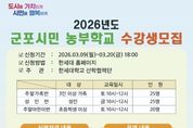 (한국글로벌뉴스 - 박소연 기자) 군포시 도시농업 활성화 지원사업 보조사업자인 한세대학교가 오는 3월 20일까지 2026년도 군포시민 농부학교 신규 수강생을 모집한다고 밝혔다. 군포시민 농부학교는 군포시민들이 도심 속에서 직접 작물을 재배하며 친환경적인 삶의 태도를 함양하고, 이웃과 소통하는 공동체 문화를 회복하기 위해 마련됐다. 특히 단순한 농사 기술 습득을 넘어 이론과 실습이 병행된 체계적인 커리큘럼을 제공할 예정이다. 올해 모집 규모는 성인반 25구좌, 주말가족반 25구좌, 주말어린이반 20구좌로 총 70구좌이며, 교육은 한세대학교 내 위치한 도시농업지원센터 전용 농장에서 진행된다. 운영 기간은 3월부터 12월까지 약 10개월간이며 총 20강에 걸쳐 절기별 작물 재배법과 생태 교육 등 다채로운 프로그램이 이어진다. 신청 접수는 3월 9일부터 3월 20일까지 진행되며 자세한 커리큘럼 및 접수 방법은 한세대학교 홈페이지 공지사항을 통해 확인할 수 있다. 군포시 관계자는 “도시농업은 먹거리를 생산하는 즐거움을 넘어 기후 위기 시대에 탄소 중립을 실천하는 소중한 발걸음이 될 것”이라며 “많은 시민이