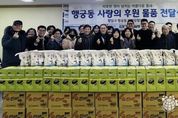 (한국글로벌뉴스 - 박소연 기자) 수원시 팔달구 행궁동은 지난 6일 설 명절을 맞아 ‘행궁동 사랑의 후원 물품 전달식’을 개최했다. 이번 전달식에는 설 명절을 앞두고 행궁동 취약계층을 위해 후원 물품을 기부한 행궁동 주민자치회를 비롯한 단체장들과 후원자들이 참석해 이웃 나눔의 의미를 함께 했다. 행궁동은 설 명절 이웃돕기를 위해 2월 5일까지 후원 물품을 접수한 결과 종교기관과 개인 후원자, 기업 등의 참여로 백미 10kg 200포와 라면 등 120박스를 후원받았다. 후원 물품은 관내 복지사각지대 및 저소득 가정에 전달될 예정이다. 전달식에 참석한 박영순 주민자치회장 등 행궁동 단체장들은 “명절마다 이어지는 나눔이 어려운 이웃에게 작은 위로가 되길 바란다”며 “앞으로도 지역사회 나눔 문화 확산에 적극 동참하겠다”고 전했다. 최영희 행궁동장은 “설 명절을 맞아 따뜻한 마음으로 후원에 동참해 주신 분들게 깊이 감사드린다”며, “지역의 소중한 복지자원과 이웃에 대한 관심이 촘촘한 복지행정을 실천하는 큰 힘이 되고 있으며, 후원해 주신 물품은 도움이 필요한 가정에 정성껏 전달하겠다”고 말했다.