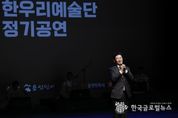 (한국글로벌뉴스 - 박소연 기자) 용인특례시는 5일 오후 수지구 용인평생학습관 큰어울마당에서 ‘한우리예술단 정기공연’이 열렸다고 6일 밝혔다. 용인특례시가 후원하고 용인민예총이 주최·주관한 이날 행사는 우리 고유의 가락과 춤을 한자리에서 만날 수 있는 전통 공연으로 꾸며졌고, 이상일 시장은 1시간 40분간 진행된 공연을 끝까지 지켜본 뒤 공연단을 격려했다. 공연은 농악, 민요, 가야금, 검무 등으로 우리 민족 고유의 소리와 정서, 삶의 이야기를 그려내 큰 박수갈채를 받았다. 할미성 농악 보존회는 꽹과리, 장구, 북, 징, 태평소 등의 악기를 활용해 역동적인 농악 판굿을 선보였다. 용인 아리랑 보존회는 청춘가, 태평가, 창부타령 등 흥겨운 경기민요를 열창하며 분위기를 이끌었다. 이어 검무가 남지연씨의 검무공연이 펼져졌다. 앙상블 더 가야금은 대중에게 친숙한 고향의 봄, 꽃타령, 까투리타령 등을 가야금 병창으로 들려주며 국악의 매력을 선사했다. 한우리예술단은 화려한 가락이 돋보이는 설장구로 타악의 진수를 보여줬다. 이상일 시장은 축사에서 “올해로 32회
