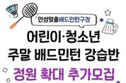 (한국글로벌뉴스 - 박소연 기자) 안성시시설관리공단은 안성 시민 생활체육 활성화를 위해 현재 운영 중인 주말 어린이・청소년 배드민턴 강습반 정원을 확대하고 추가 수강생을 모집한다고 밝혔다. 이번 주말 어린이・청소년 배드민턴 강습반은 개설 이후 학부모와 수강생들의 높은 관심 속에 연일 정원이 마감될 정도로 큰 호응을 얻고 있다. 특히 주말을 활용해 어린이와 청소년들이 체계적으로 생활 체육을 접할 수 있다는 점에서 학부모들의 만족도가 높은 프로그램으로 자리 잡고 있다. 공단은 이러한 시민 수요를 적극 반영하기 위해 강습반 정원을 기존보다 확대하고, 오는 3월 23일 오전 9시부터 3월 31일 오후 10시까지 초등학생부터 고등학생까지의 어린이·청소년을 대상으로 선착순 10명을 추가 모집한다. 신청은 실내체육관 사무실에 전화로 문의한 뒤 방문 접수로 진행될 예정이다. 이정찬 이사장은 “시민들의 높은 관심에 부응하기 위해 앞으로도 누구나 쉽게 참여할 수 있는 생활체육 환경을 만들어 가겠다”고 전했다. 현재 안성시시설관리공단에서는 시민들의 건강증진을 위하여 주말 강습반 외 매주 2회(화,목) 오전‧오후‧저녁‧