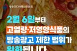 (한국글로벌뉴스 - 박경희 기자) ■ 2월 6일부터 고열량·저영양식품의 방송광고 제한 범위가 완화됩니다. 17~19시 모든 프로그램 → 17~19시 어린이 주시청대상 프로그램 어린이 대상 드라마·퀴즈·게임·다큐멘터리· 애니메이션, 어린이 교육 및 정보 등