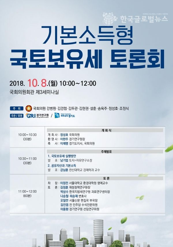 4일 경기도에 따르면 정성호 국회의원 등 8명의 국회의원이 공동주최하고 경기연구원이 주관하는 ‘기본소득형 국토보유세’ 토론회가 오는 8일 오전 10시 국회의원회관 제3세미나실에서 개최된다.