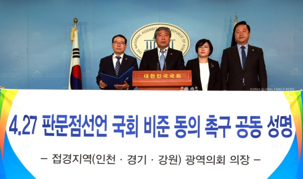“경기도와 인천·강원 의회의장은 3개 접경지역 1천800만 시·도민의 뜻으로 4·27 판문점 선언의 국회 비준동의를 강력히 촉구합니다!”