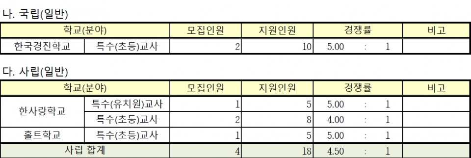 분야별 선발 대비 지원 인원은 ▲유치원 교사 250명 선발에 2,361명 지원 ▲초등학교 교사 1,091명 선발에 1,931명 지원 ▲특수(유치원) 교사 54명 선발에 205명 지원 ▲특수(초등) 교사 107명 선발에 512명 지원으로 총 5,009명이다.