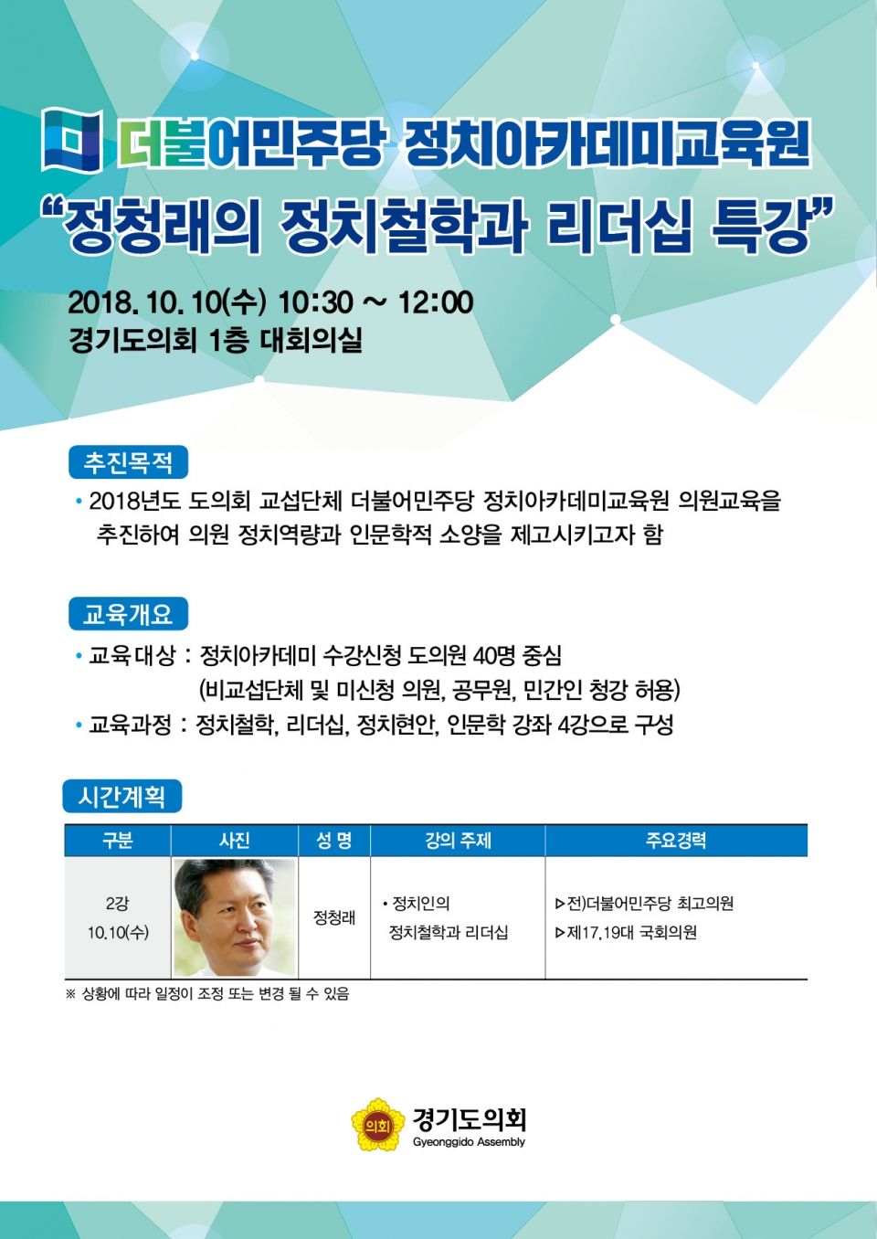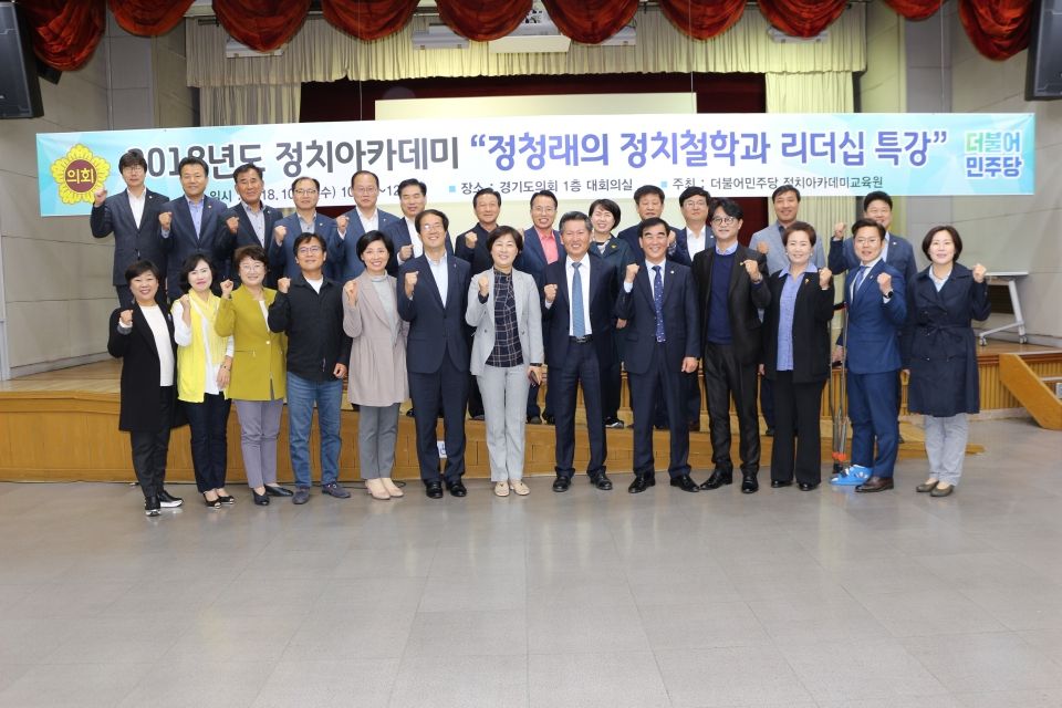경기도의회 더불어민주당 정치아카데미교육원(원장 김현삼)은 10일(수) 도의회 1층 대회의실에서 『2018년 정치아카데미 제2강 ‘정청래의 정치철학과 리더십 특강’』을 개최했다.