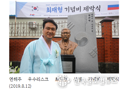 지난해 8월에는 연해주 우수리스크에 최재형 선생 기념비를 건립하고 최재형 선생 민족학교 설립을 추진하기도 했으며, 조선의열단 100주년 기념사업 추진위원으로 활동하면서 김원봉 선생 국회 학술 세미나와 안희제 선생 76주년 추모 학술세미나를 주최하기도 했다.