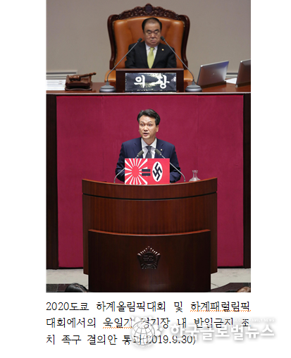 또한, 안민석 의원은 2020년 도쿄올림픽에서 일제 전범기인 욱일기 응원을 금지하는 국회 결의안을 추진해 통과시키는 등 일본의 군국주의 부활을 비판하는 활동을 지금까지 꾸준히 벌여오고 있다. 광복회는 안민석 의원의 이러한 활동에 대해 높이 평가하며 우리 시대의 독립군으로 선정했다고 밝혔다.