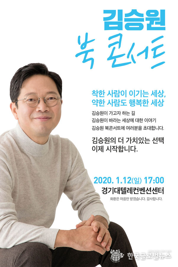 (한국글로벌뉴스 -박소연 기자) 김승원 예비후보(더불어민주당, 수원시갑)의 북콘서트가 오늘 12일 오후 5시부터 약 1시간가량 경기대학교 텔레컨벤션센터에서 발 디딜 틈 없이 모여든 관객들과 함께 성황리에 개최되었다.