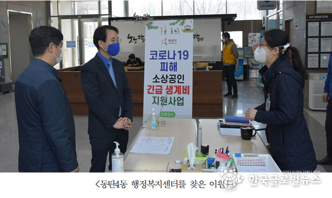 (한국글로벌뉴스 -박소연 기자) 더불어민주당 경기 화성을 이원욱 의원은 27일 오후 동탄4동 행정복지센터를 방문해 코로나19 발 경제 위기에 가장 큰 타격을 받고 있는 자영업자와 소상공인 지원 서비스 현황을 살피기 위해 현장 점검에 나섰다.