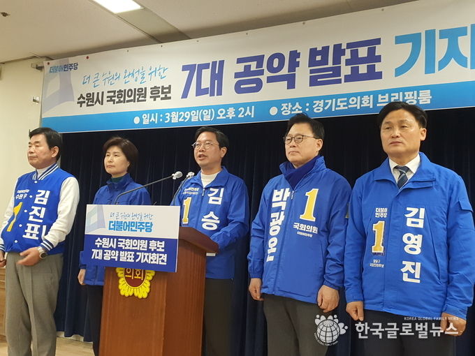 김승원(갑), 백혜련(을), 김영진(병), 박광온(정), 김진표후보(무, 이상 선거구 순)는 29일 오후 2시 경기도의회 브리핑룸에서 기자회견을 통해 ‘더 큰 수원의 완성’을 위한 7대 공약을 발표하는 자리를 가졌다.