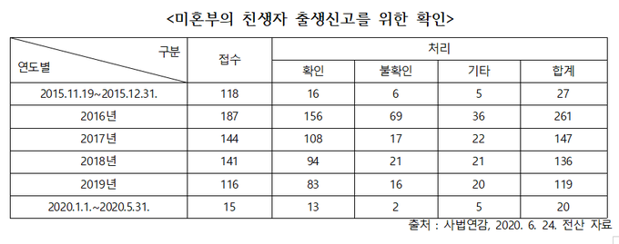 지난 2015년 미혼부의 출생 신고 간소화를 위한 관련법이 국회를 통과했지만, 법원별로 해석의 차이가 존재하고 대다수의 경우 법조항을 엄격하게 적용해, 법원행정처 자료에 따르면, 지난 5년간 약 35%의 미혼부가 출생신고를 하지 못한 것으로 나타났다.