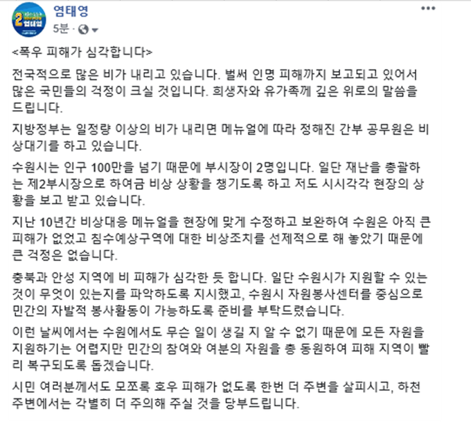 염태영 후보는 8월2일 페이스북을 통해 “충북과 안성 지역에 비 피해가 심각한 듯”하다며 “수원시가 지원할 수 있는 것이 무엇이 있는지를 파악하도록 지시했다”고 밝혔다.