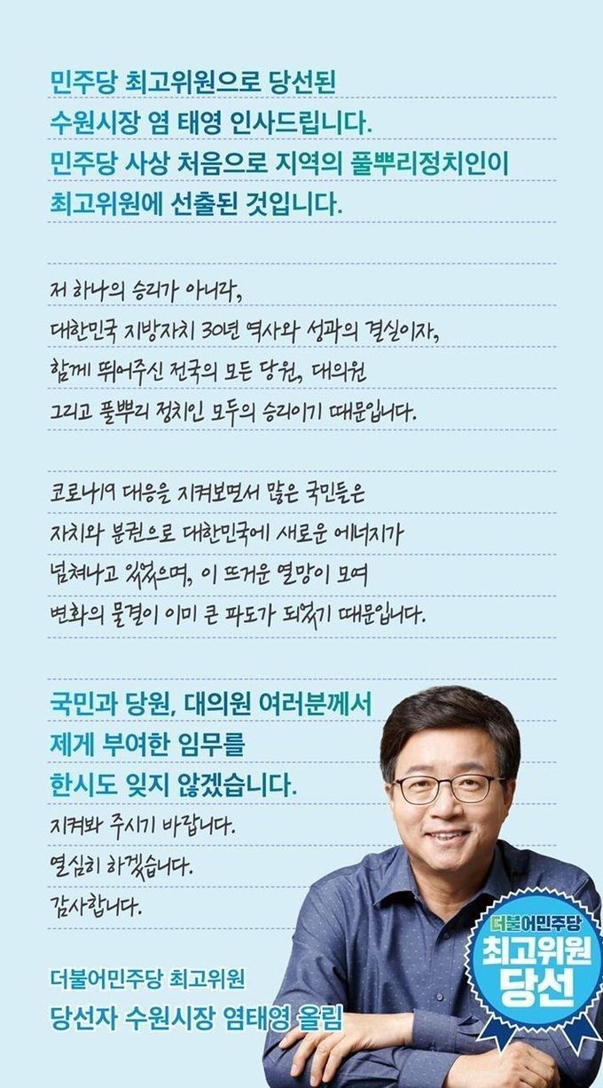 민주당 최고위원으로 당선된 수원시장 염 태영 인사드립니다. 민주당 사상 처음으로 지역의 풀뿌리정치인이 최고위원에 선출된 것입니다.