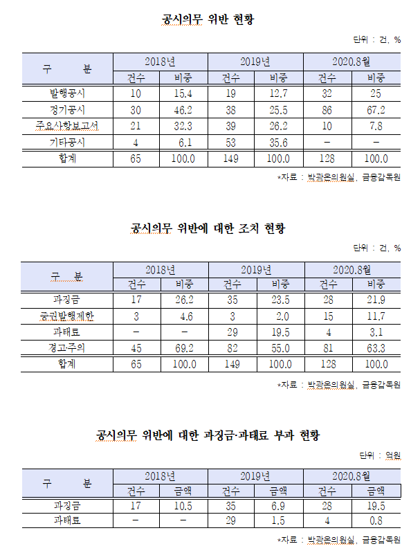 국회 정무위원회 소속 더불어민주당 박광온 의원이 금융감독원으로부터 제출받은 ‘공시의무 위반 현황’자료에 따르면 올해 1월~8월 기업의 공시의무 위반 건수는 128건으로 집계됐다.