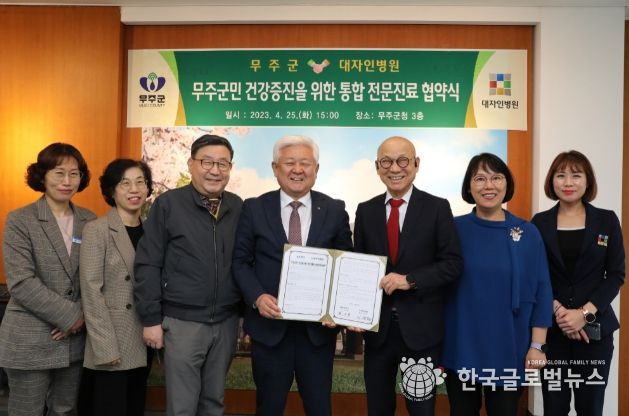 (한국글로벌뉴스 - 박소연 기자) 무주군은 지난 25일 무주군청에서 대자인병원과 통합 전문 진료 협약을 체결했다. 이날 협약은 전문 의료기관과의 연계 · 협력을 통해 군민건강 증진과 회복에 기여한다는 취지에서 진행된 것으로,