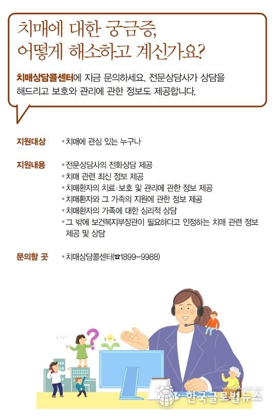 (한국글로벌뉴스 - 박경희 기자) 치매상담콜센터에 지금 문의하세요. 전문상담사가 상담을 해드리고 보호와 관리에 관한 정보도 제공합니다.