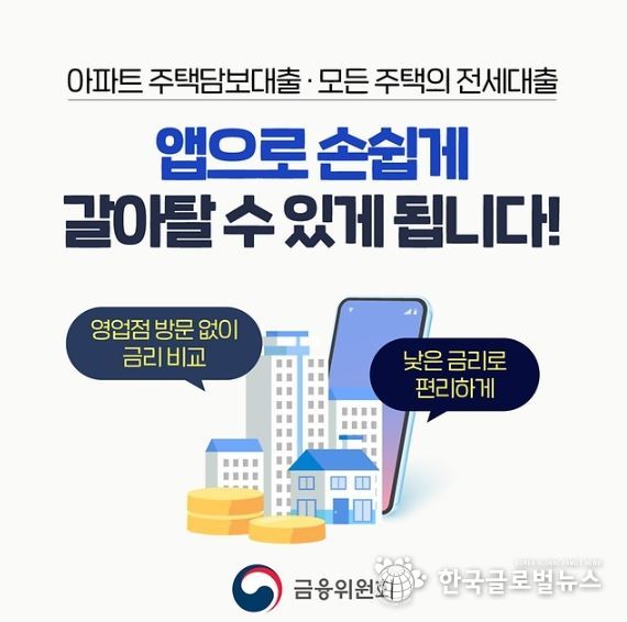 (한국글로벌뉴스 - 박경희 기자) 아파트 주택담보대출과 모든 주택의 전세대출을 받은 금융소비자도 대환대출 인프라를 이용해 금리를 비교하여, 낮은 금리로 편리하게 갈아탈 수 있게 됩니다!
