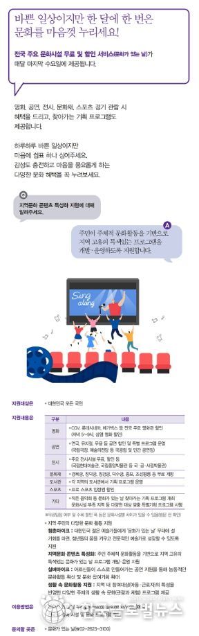 (한국글로벌뉴스 - 박경희 기자) 전국 주요 문화시설 무료 및 할인 서비스(문화가 있는 날)가 매달 마지막 수요일에 제공됩니다.
