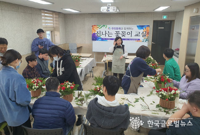 (한국글로벌뉴스 - 박경희 기자) 24일 오후 3시 부천시 장애인회관에서는 발달장애청소년 10명이 꽃바구니 만드는 방법을 배우는 수업이 한창 진행되고 있었다.