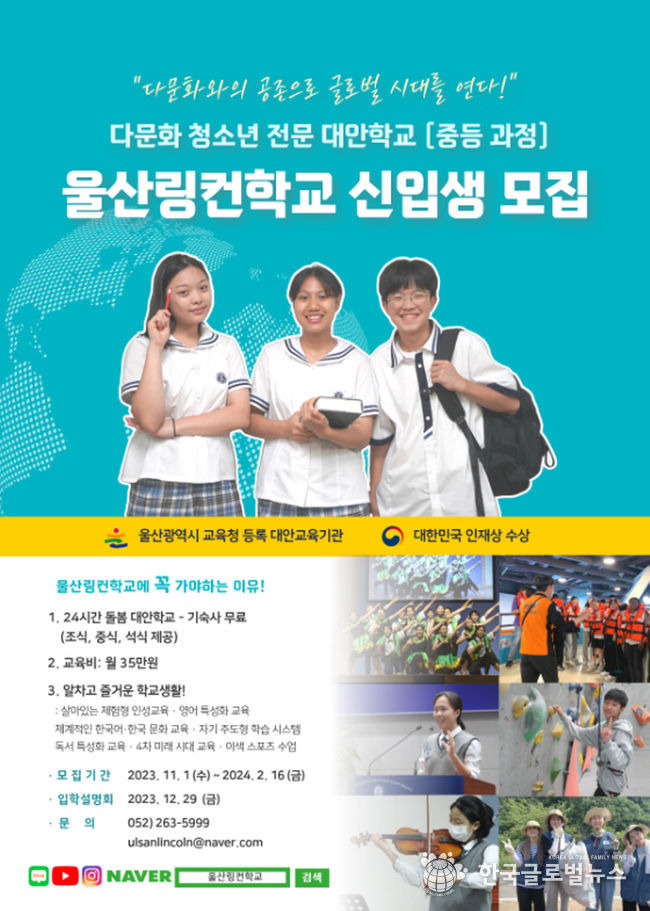 (한국글로벌뉴스 - 박경희 기자) 울산링컨학교는 2024년도에 다문화 가정 청소년과 중도 입국 청소년을 대상으로 24시간 돌봄형 대안학교로 운영되고 있고, 현재 중등과정 신입생을 모집 중에 있다.
