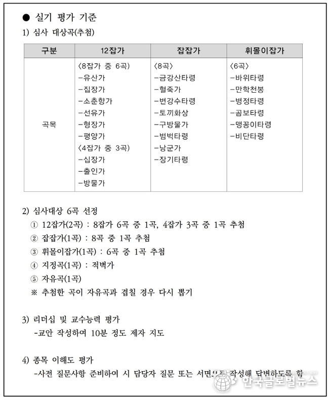 발표에 따르면, 12잡가는 유산가를 포함한 12곡 중에서 2곡, 잡잡가 8곡 중에서 1곡, 그리고 휘몰이잡가 6곡 중에서 1곡을 추첨을 통해 선정하며, 지정곡으로는 '12잡가' 중 '적벽가'를, 응시자가 선택하는 자유곡 1곡을 포함하여 총 6곡을 심사 평가 대상곡으로 구성했다.