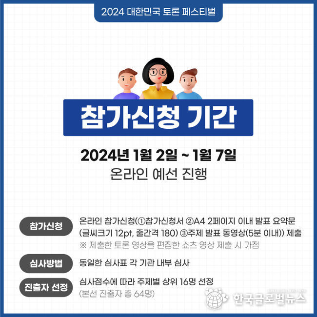 참가자 신청은 2024년 1월2일(화)부터 1월 7일(일) 자정까지이며, 2024 대한민국 토론 페스티벌 홈페이지에 공지된 참가신청 이메일로 접수 가능하다.