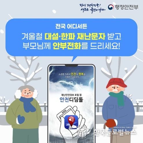 (한국글로벌뉴스 - 박경희 기자) 전국 어디서든 겨울철 대설·한파 재난문자 받고 부모님께 안부전화를 드리세요!