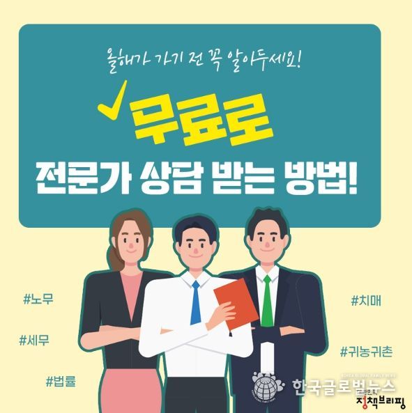 (한국글로벌뉴스 - 박경희 기자) 일상 생활에서 전문가의 도움이 필요한 경우가 많은데요. 하지만 경제적 이유나 상황에 맞는 전문가를 찾지 못해 상담을 받지 못하는 일도 많습니다. 법률, 세무, 노무, 치매, 귀농귀촌 등의 분야에서 전문가의 심도 깊은 상담을 받을 수 있는 방법을 소개합니다!
