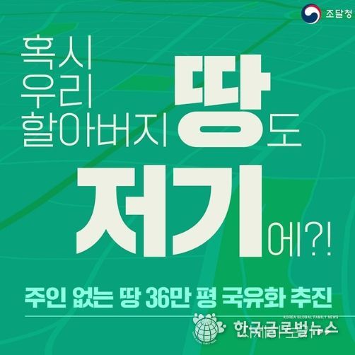 (한국글로벌뉴스 - 박경희 기자) 조달청은 주인 없는 땅 952필지(36만 3,000평)의 국유화를 추진합니다.