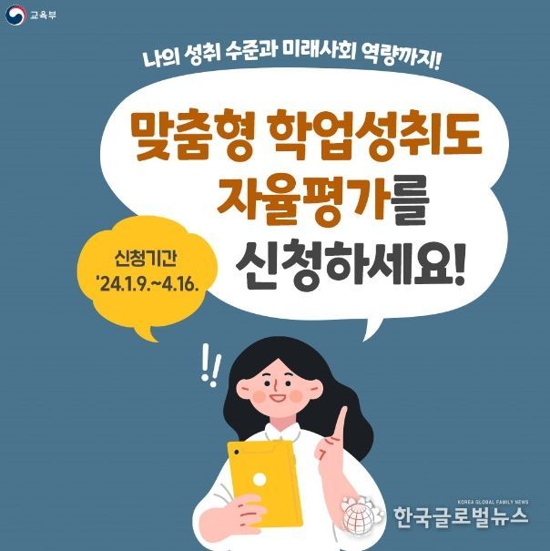 (한국글로벌뉴스 - 박경희 기자) 맞춤형 학업성취도 자율평가란, 컴퓨터 기반 역량 중심 평가로 컴퓨터, 노트북, 태블릿 등을 이용해 개별학생의 성취 특성을 진단하는 평가입니다. 희망하는 일자와 학년, 학급, 과목 등을 자율적으로 선택하여 평가에 참여할 수 있습니다.
