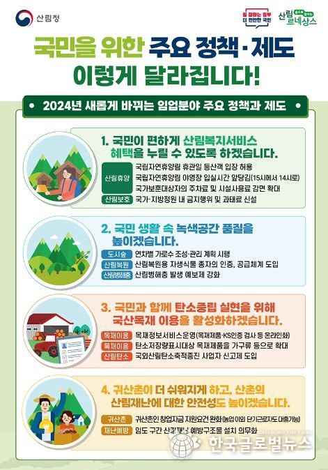 (한국글로벌뉴스 - 박경희 기자) 2024년 산림청은 국민에게 더 도움이 되고 더 많은 혜택을 드릴 수 있도록 주요정책과 제도를 이렇게 바꾸겠습니다!