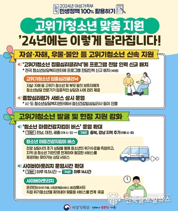 (한국글로벌뉴스 - 박경희 기자) 집중심리클리닉 등을 통한 신속한 지원과 고위기청소년 발굴 및 현장 지원 강화로 청소년의 마음건강을 위한 맞춤 지원을 강화합니다!