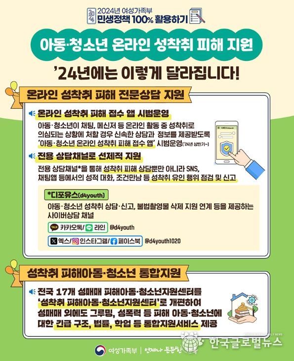 (한국글로벌뉴스 - 박경희 기자) 온라인 성착취 피해 전문상담과 지원센터 개편으로 성착취 피해아동·청소년 지원을 강화합니다!