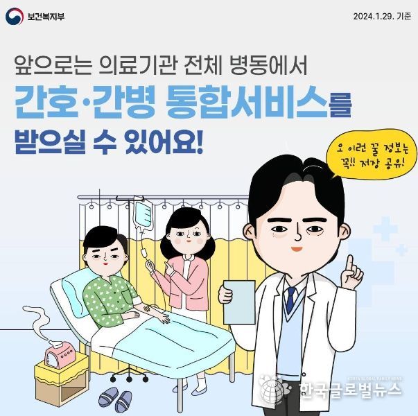 (한국글로벌뉴스 - 박경희 기자) 앞으로는 의료기관 전체 병동에서 간호·간병 통합서비스를 받으실 수 있어요!
